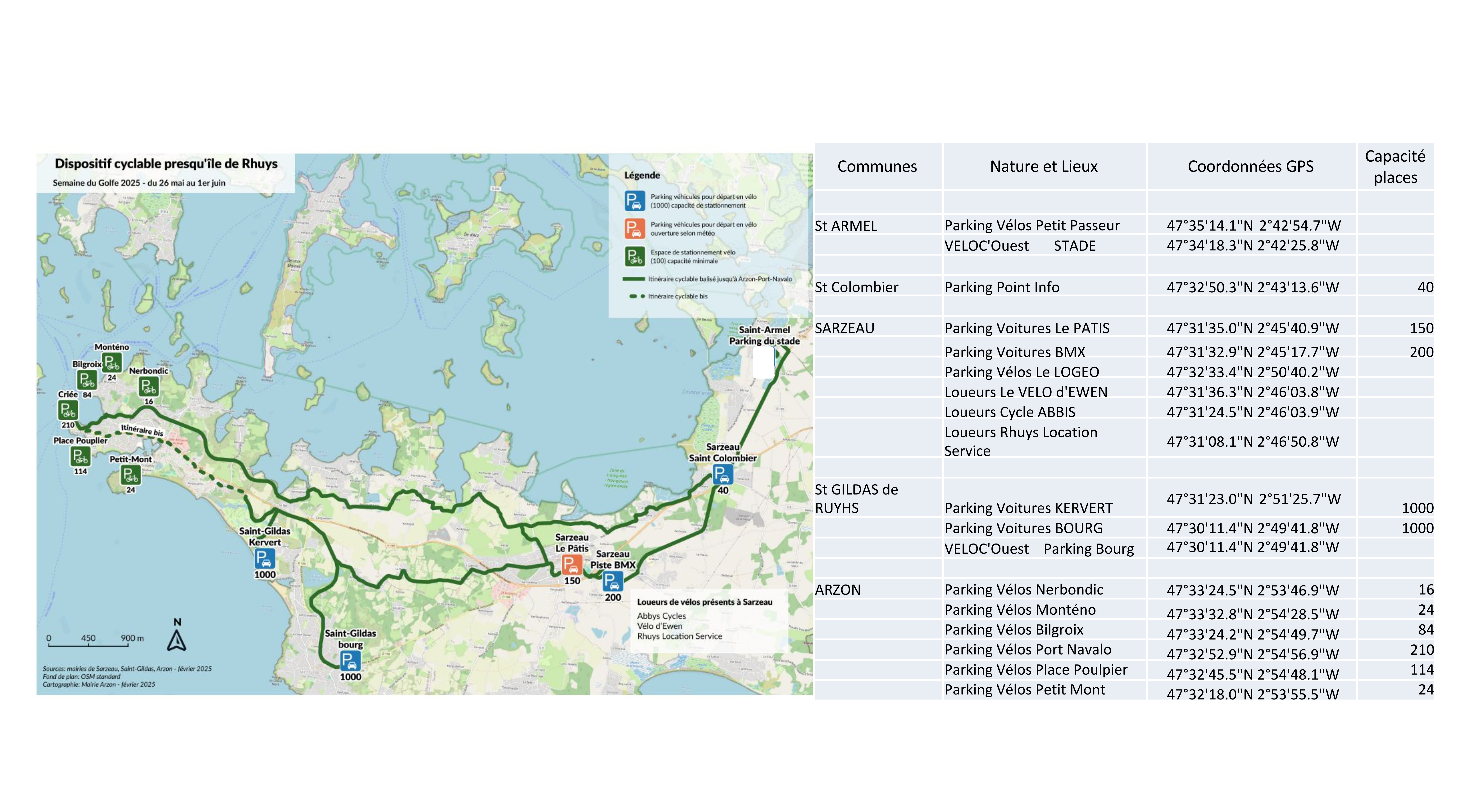 Please note: the two Véloc'Ouest car parks in Saint-Armel (Stade Lucien le Godec, 30 rue Lann Borzat, 56450 Saint-Armel) and Saint-Gildas de Rhuys (28 Route de Sarzeau, 56730 Saint-Gildas-de-Rhuys) will be open on Saturday 31 May 2025, the day of the Grande Parade.